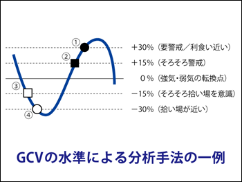 GCV¤ÎÎò»Ë¤ò¤µ¤«¤Î¤Ü¤ë¤È¡¢¼Â¤Ï¤³¤Î»ØÉ¸¤Î¥¯¥í¥¹¤ÇÇäÇ㥿¥¤¥ß¥ó¥°¤òª¤¨¤ëÊýË¡¤È¤¤¤¦¤Î¤Ï¡¢Èæ³ÓŪ¿·¤·¤¤¼êË¡¤Ê¤Î¤Ç¤¹¡£¤³¤ì¤è¤ê¤âÁ°¤«¤é»È¤ï¤ì¤Æ¤¤¤¿Ê¬ÀϼêË¡¤¬¤¢¤ê¤Þ¤¹¡£»ØÉ¸¤Î¿å½à¤«¤é¡¢ÇäÇ㥿¥¤¥ß¥ó¥°¤òª¤¨¤ëÊýË¡¤Ç¤¹¡£¤³¤Á¤é¤Ï¥ª¡¼¥È¥â¡¼¥É¤Ë¤ÏÂбþ¤µ¤ì¤Æ¤¤¤Þ¤»¤ó¡£Î㤨¤Ð¡Ö»ØÉ¸¤¬£°¡ó°Ê¾å¤Ë¤¢¤Ã¤¿¤é¡¢³ô²Á¤ÎÀª¤¤¤¬¾å¸þ¤¤Èª¤¨¤ë¡×¤Ê¤É¤È¤¤¤Ã¤¿¤â¤Î¤Ç¤¹¡£¥¯¥í¥¹¤Ç¤Ï¤Ê¤¯¡¢¡Ö¸½ºß»ØÉ¸¤¬¤É¤Î¤è¤¦¤Ê°ÌÃÖ¤ò¿ä°Ü¤·¤Æ¤¤¤ë¤«¡©¡×¤È¤¤¤¦¤Î¤¬½ÅÍפÊÅÀ¤Ë¤Ê¤ê¤Þ¤¹¡£Î㤨¤Ð¡¢GCV¤Î¾ì¹ç¤Ï¥×¥é¥¹¤ÎÎΰè¤ò¾å¾º¤·¤Æ¤¤¤ì¤Ð¡Ö¶¯µ¤¶ÉÌ̡פȸ«¤ë¤³¤È¤¬¤Ç¤¤Þ¤¹¡£¤³¤¦¤¤¤Ã¤¿Ê¬ÀÏÊýË¡¤Ë¤Ê¤ê¤Þ¤¹¡£¤³¤ì¤Ï¡¢Â¾¤Î»ØÉ¸¤Ç¤âƱ¤¸¤è¤¦¤Ê¸«Êý¤¬¤¢¤ê¤Þ¤¹¡£¥Æ¥¯¥Ë¥«¥ëʬÀϤ˴·¤ì¤¿Êý¤Ç¤¢¤ì¤Ð¡¢¤³¤Î¼ê¤Î¿å½à¤Ë¤è¤ëʬÀϤϡ¢ÆÀ°Õ¤È¤µ¤ì¤ë¤«¤â¤·¤ì¤Þ¤»¤ó¡£¿å½à¤Ë¤è¤ëÇäÇãȽÃǤ¬¡¢¥ª¡¼¥È¥â¡¼¥É¤Ç¤ÏÂбþ¤·¤Æ¤¤¤Ê¤¤¤Î¤Ë¤Ï¡¢Íýͳ¤¬¤¢¤ê¤Þ¤¹¡£¤½¤ì¤Ï¤³¤ÎʬÀϼêË¡¤Î¾ì¹ç¡¢¡Ö³ô²Á¤Î²¼¤²»ß¤Þ¤ê¡¢ÄìÆþ¤ì¤òÂԤĤ٤¿å½à¡×¤Ê¤É¤È¤¤¤¦È½ÃǤǤ¢¤ê¡¢¡ÖÇ㤤¥µ¥¤¥ó¡×¡ÖÇä¤ê¥µ¥¤¥ó¡×¤È¤¤¤¦¥Ô¥ó¥Ý¥¤¥ó¥È¤Î¥¿¥¤¥ß¥ó¥°¤ò¼¨º¶¤¹¤ë¤Ë¤ÏÉÔ¸þ¤¤À¤«¤é¤Ç¤¹¡£½¾¤Ã¤Æ¥ª¡¼¥È¥â¡¼¥É¤Ç¤Ï»È¤ï¤Ê¤¤¤È¤¤¤¦¤ï¤±¤Ç¤¹¡£¤É¤Á¤é¤«¤È¤¤¤¦¤È¡¢¤³¤Î¿å½à¤Ë¤è¤ëʬÀϤϡ֤½¤í¤½¤í¥¿¥¤¥ß¥ó¥°¤¬Íè¤Þ¤¹¤è¡ª¡×¤È¤¤¤¦¤è¤¦¤Ê¡¢ÇäÇã¤Î¥¿¥¤¥ß¥ó¥°¤¬Íè¤ë¤³¤È¤ò¡¢»öÁ°¤Ë¤ªÃΤ餻¤¹¤ëµ¡Ç½¤È¸À¤¨¤ë¤«¤â¤·¤ì¤Þ¤»¤ó¡£