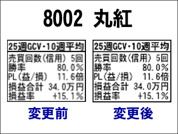 ¡¡8001°ËÆ£Ã龦»ö¤Î¸«Ä¾¤·Á°¤Ï¡¢24½µGCV¡¢GCV¤ÎÊ¿¶ÑÀþ¤Ï11½µ¤Ç¤·¤¿¡£¸«Ä¾¤·¸å¤Ï¡¢20½µGCV¡¢Ê¿¶Ñ6½µ¤È¤Ê¤Ã¤Æ¤¤¤Þ¤¹¡£¤³¤ÎÌÃÊÁ¤Ï¡¢¼þ´ü¤¬ÊѤï¤ê¤Þ¤·¤¿¤Í¡£°ìÊý¡¢8002´Ý¹È¤Î¸«Ä¾¤·Á°¤Ï¡¢25½µGCV¡¢Ê¿¶Ñ10½µ¤È¤Ê¤ê¡¢¸«Ä¾¤·¸å¤âƱ¤¸¤¯25½µGCV¡¢Ê¿¶Ñ10½µ¤È¤Ê¤Ã¤Æ¤¤¤Þ¤¹¡£°ËÆ£Ã龦»ö¤Î¼þ´ü¤¬ÊѤï¤ê¡¢´Ý¹È¤Î¼þ´ü¤ÏÊѤï¤é¤Ê¤«¤Ã¤¿¤È¤¤¤¦·ë²Ì¤Ë¤Ê¤ê¤Þ¤¹¡£´Ý¹È¤Î¾ì¹ç¤Ï¡¢¼þ´ü¤¬ÊѤï¤ê¤Þ¤»¤ó¤«¤é¡¢Êѹ¹Á°¤ËB¡ÊÇ㤤¡Ë¥µ¥¤¥óÅÀÅô¤ÇÊÝͤ·¤Æ¤¤¤ë¾ì¹ç¤Ï¡¢¥µ¥¤¥óÊѹ¹¸å¤ËS¡ÊÇä¤ê¡Ë¥µ¥¤¥ó¤¬ÅÀÅô¤¹¤ë¤È¤¤¤¦Î®¤ì¤Ë¤Ê¤ê¤Þ¤¹¡£¤·¤«¤·¡¢¼þ´ü¤¬ÊѤï¤Ã¤¿°ËÆ£Ã龦»ö¤Ïµ¤¤ò¤Ä¤±¤Ê¤±¤ì¤Ð¤Ê¤ê¤Þ¤»¤ó¡£¼þ´ü¤¬°Û¤Ê¤ë¤È¡¢Êѹ¹Á°¤ÈÊѹ¹¸å¤Î¥µ¥¤¥ó¤¬ÊѤï¤ë²ÄǽÀ¤¬¤¢¤ê¤Þ¤¹¡£Î㤨¤Ð¡¢B¡ÊÇ㤤¡Ë¤ÇÊÝͤ·¤Æ¤¤¤ë¤Ë¤â´Ø¤ï¤é¤º¡¢¼þ´üÊѹ¹¸å¤Î¥Ç¡¼¥¿¤ò¥Á¥§¥Ã¥¯¤¹¤ë¤È¡¢S¡ÊÇä¤ê¡Ë¤Ç¤ÎÊÝͤËÊѤï¤Ã¤Æ¤¤¤ë¾ì¹ç¤â¤¢¤ê¤Þ¤¹¡£¡Ö¤É¤Î¤è¤¦¤Ë¤¹¤ì¤Ð¤è¤¤¤Î¡©¡×¤È¤ªÇº¤ß¤Ë¤Ê¤é¤ì¤ë¤³¤È¤Ç¤·¤ç¤¦¡£