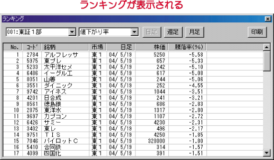| Aグループとランキングメニューを選択してください(例ではグループを東証1部、メニューを値下がり率で選択しています)。 Bメニューの選択が終わりましたら「日足」「週足」「月足」のボタンのうち、どれか1つをクリックしてください(「日足」ボタンでは日足ベースのランキング、「週足」ボタンでは週足ベースのランキング、「月足」ボタンでは月足ベースのランキングがそれぞれ表示されます)。 |