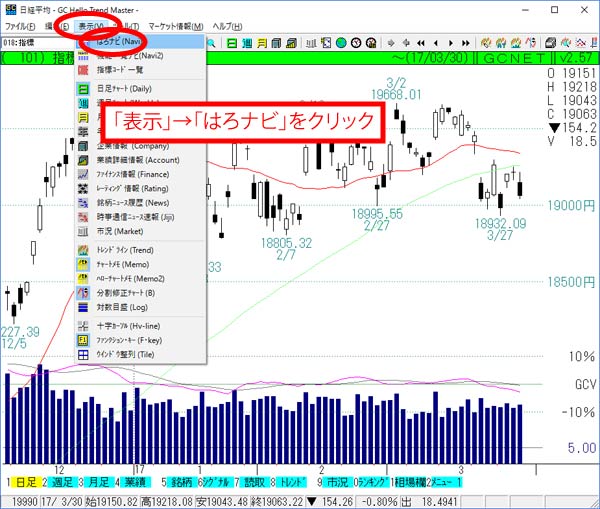 「ナビ」を2つに追加!使いやすい方を選択できる「はろナビ」が新しくなり、さらに、もう1つのナビ「機能一覧ナビ」が追加され、選択できるようになりました。 @「表示」から「はろナビ」をクリック。
