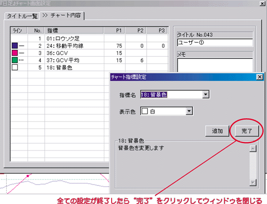 | R設定が完了したら、チャート指標設定ウィンドゥの「追加」ボタンをクリックし、『日足』チャート画面設定のウィンドゥに背景色が追加されていることを確認してください。これで背景色の設定は終了です。 S以上で全ての設定が完了しました。ここまで各指標の設定を行った「チャート指標設定画面」の右下にある「完了」ボタンをクリックしてこのウィンドゥを閉じてください。 |