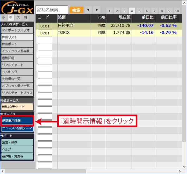 @トレーディングサポートJ-GXを開き、画面左にある「適時開示情報」をクリック