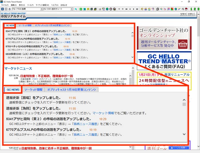 GC HELLO TREND MASTER(R)の市況画面で相場情報・銘柄情報のニュースをリアルに配信します。また、弊誌「週刊ゴールデンチャート」に記載のコラムをご覧いただけます。その他、発表された各種データや決算などの情報をご覧いただけます。刻々と変化する東京市場の動向を効率的にチェックできます。
