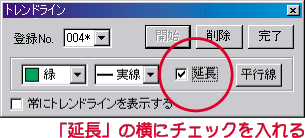 @1のトレンドラインの基本的な引き方で説明した要領で「トレンドライン設定ウィンドゥ」を開き、新たな「登録No.」を設定(例ではNo.004)してトレンドラインを引いてください。 Aトレンドラインを引き終わると「決定します。よろしいですか。」というメッセージウィンドゥが表示されますので、よければ「はい」をクリックします。その後、「トレンドライン設定ウィンドゥ」が再度表示されます。このウィンドゥ内にある「延長」という文字の横にある欄にチェックを入れてください。 ※表示色をカラーユニバーサルデザインに変更しました。詳細はこちらをご覧ください。