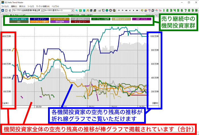 確認をしたい銘柄をチャート画面で表示しておいて、「表示」→「機関投資家・空売り残高」をクリックするとご覧いただけます(売り残高が無い銘柄は空白で表示されます)。