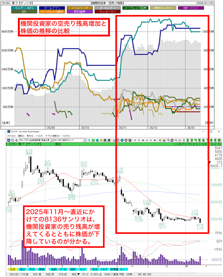 東京証券所が毎日2営業日前の機関投資家の動向を公表していますが、その「売りの残高動向」を分かりやすくグラフにまとめました。「機関投資家の売りの残高」が増えてくると上値が重くなり、逆に減ってくると上値が軽くなる傾向にあります。日足のチャートと機関投資家の動きと照らし合わせてお使いください。