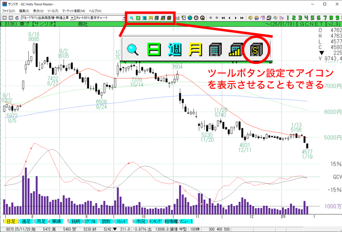 ツールボタン設定でアイコンを表示させることもできます。ツールボタン設定に関してはこちらをご覧ください。